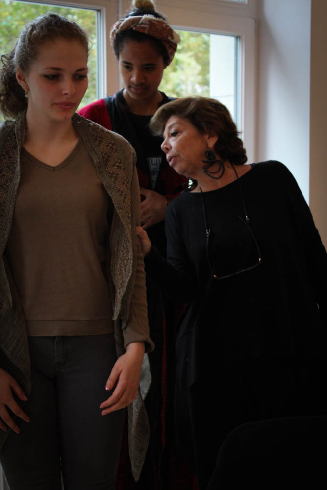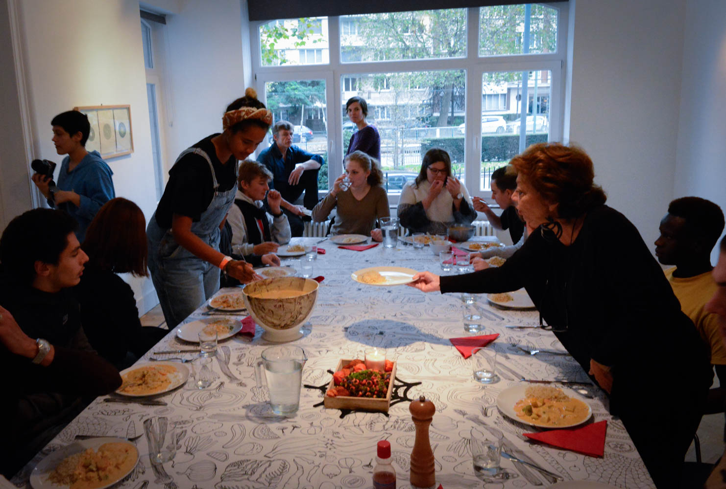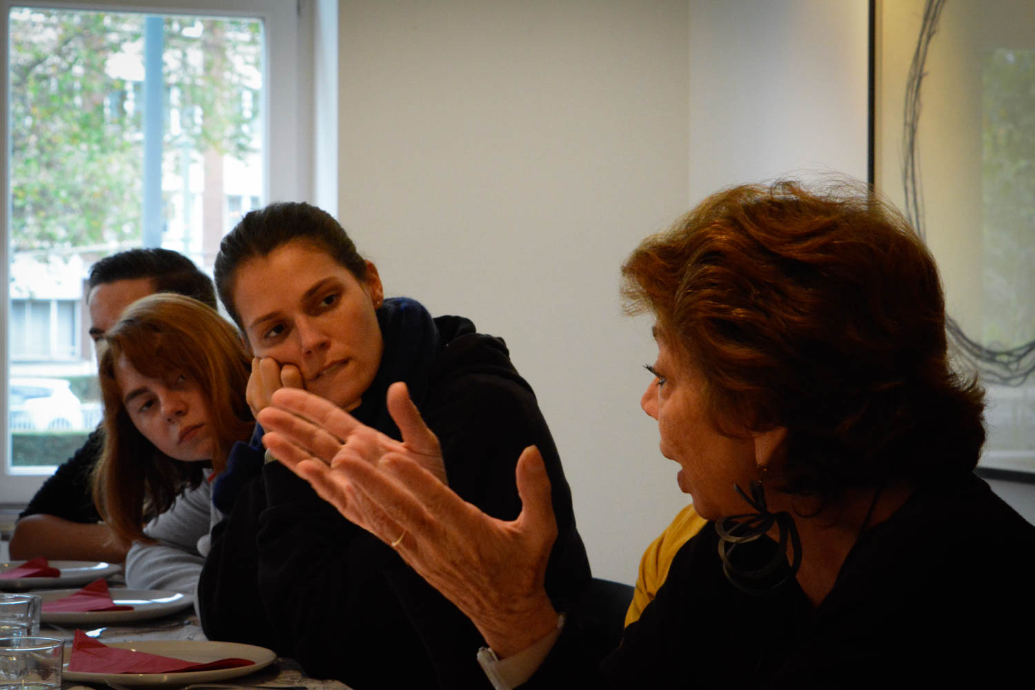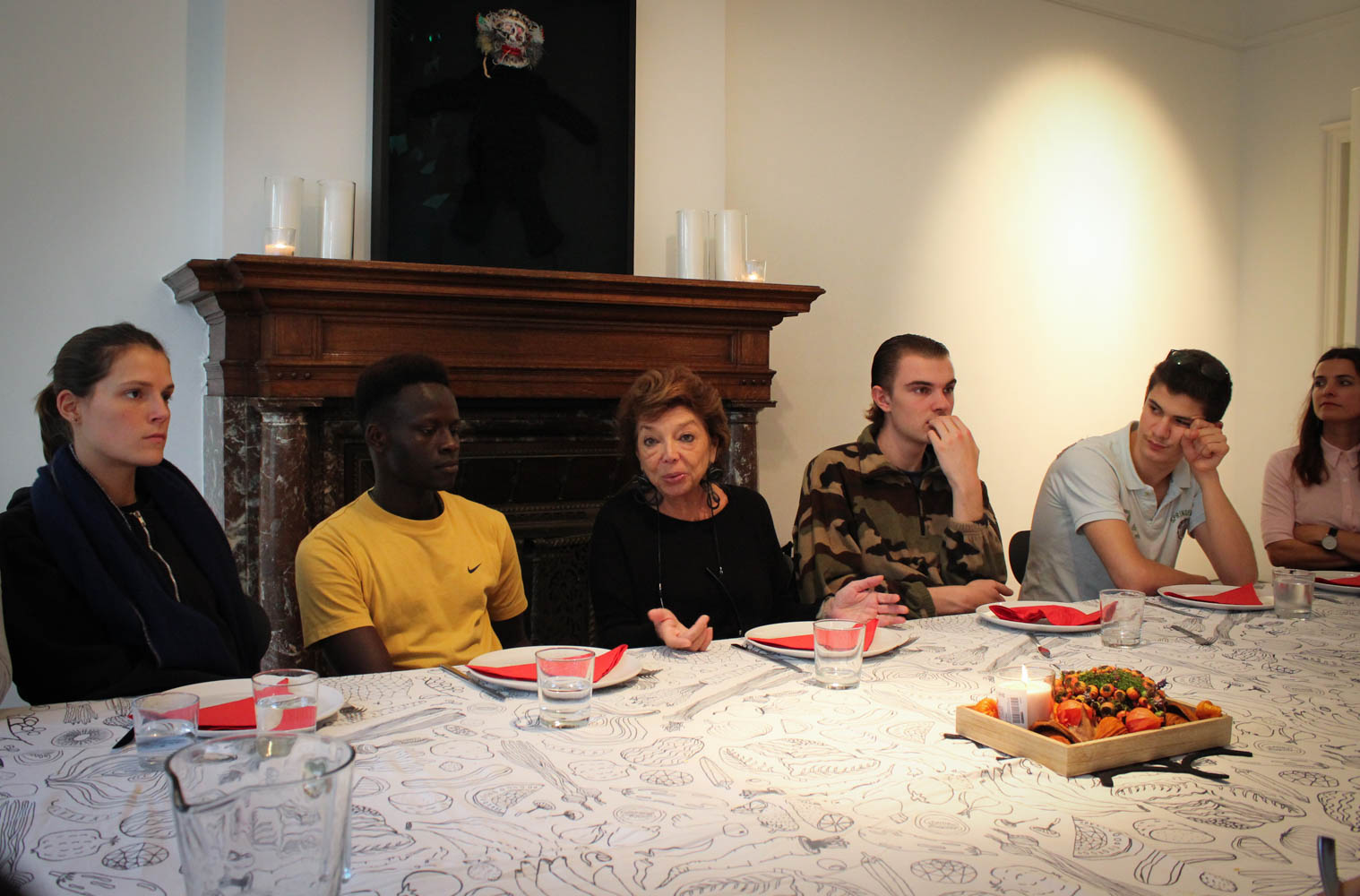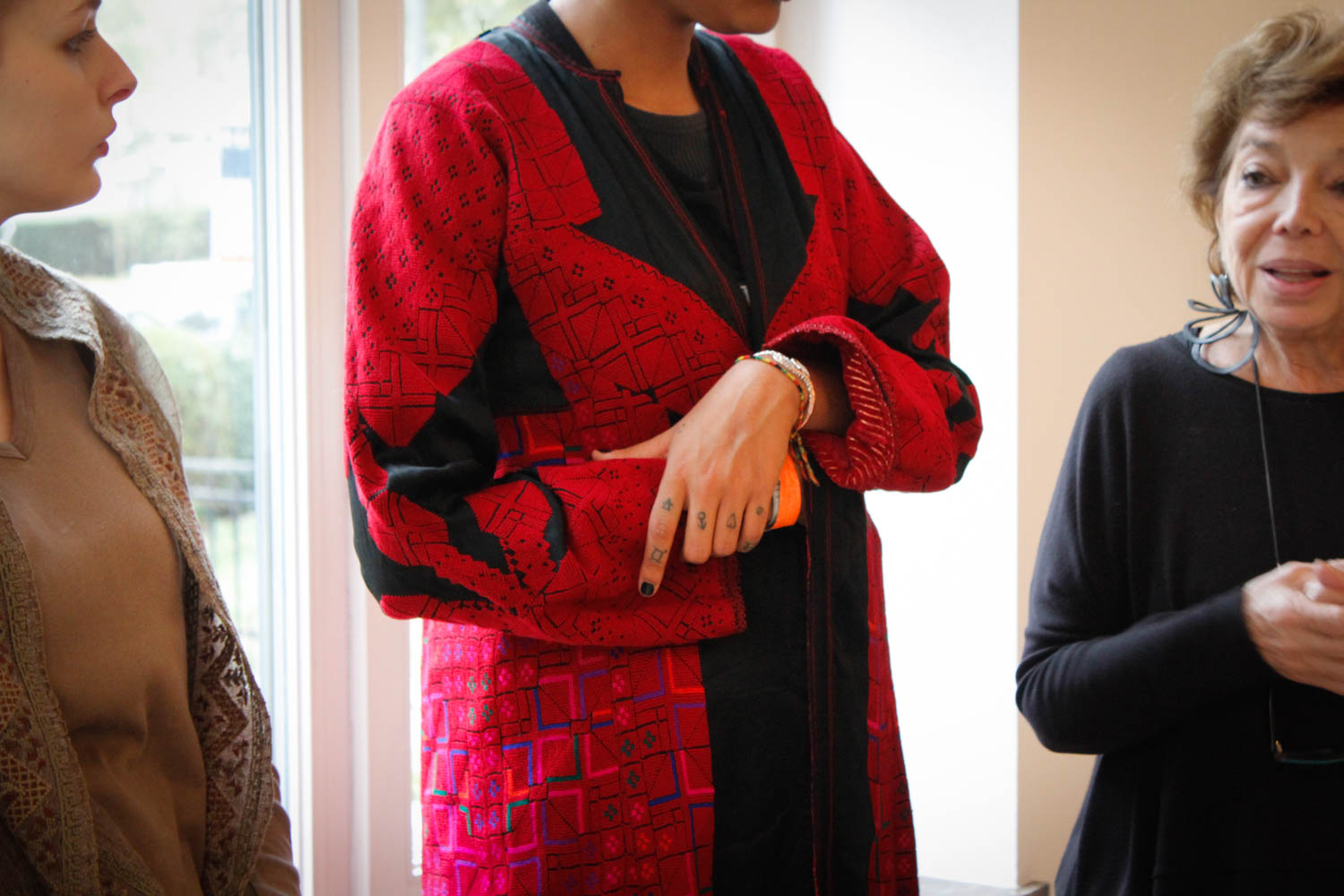 Attentive à Out of the Box depuis sa création, Leila Chahid ne manque jamais de venir déjeuner avec les jeunes quand elle est à Bruxelles. Diplomate réputée, partisane de la paix et grande intellectuelle, Leila a choisi de nous parler de ses racines palestiniennes, ce 26 octobre, à travers la tradition artisanale des broderies de ce peuple malmené depuis des décennies. L’occasion d’une petite démonstration de ce savoir-faire que l’association Inaash, fondée par la mère de Leila dans les années 1960, a fait revivre dans les camps palestiniens. De la soie, du najaf (tissage de laine de chèvre d’origine irakienne), des couleurs magnifiques, des motifs brodés à la main avec une infinie patience, des perles : magnifique !!!